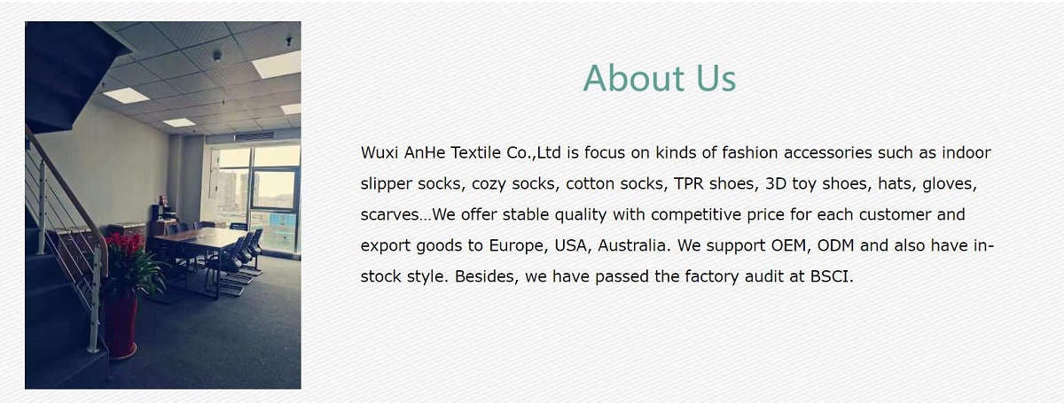 Wuxi AnHe Textile Co.,Ltd is focus on kinds of fashion accessories such as indoor slipper socks, cozy socks, cotton socks, TPR shoes, 3D toy shoes, hats, gloves, scarves…We offer stable quality with competitive price for each